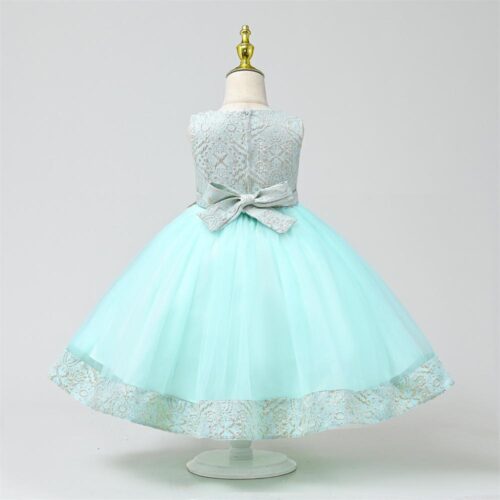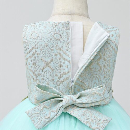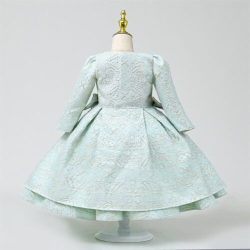 Light green girls dress with intricate gold embroidery, long sleeves, and a full, layered skirt.