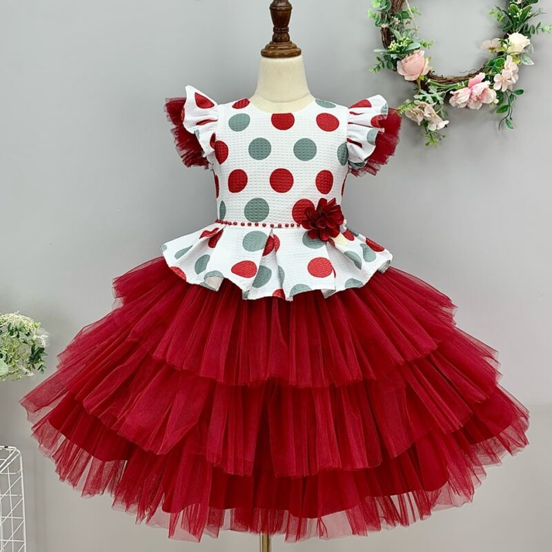 This delightful dress features a white bodice adorned with large red and gray polka dots. The bodice has short ruffled sleeves with red tulle accents. The waistline is enhanced with a peplum detail showcasing a red flower and a row of small red beads.